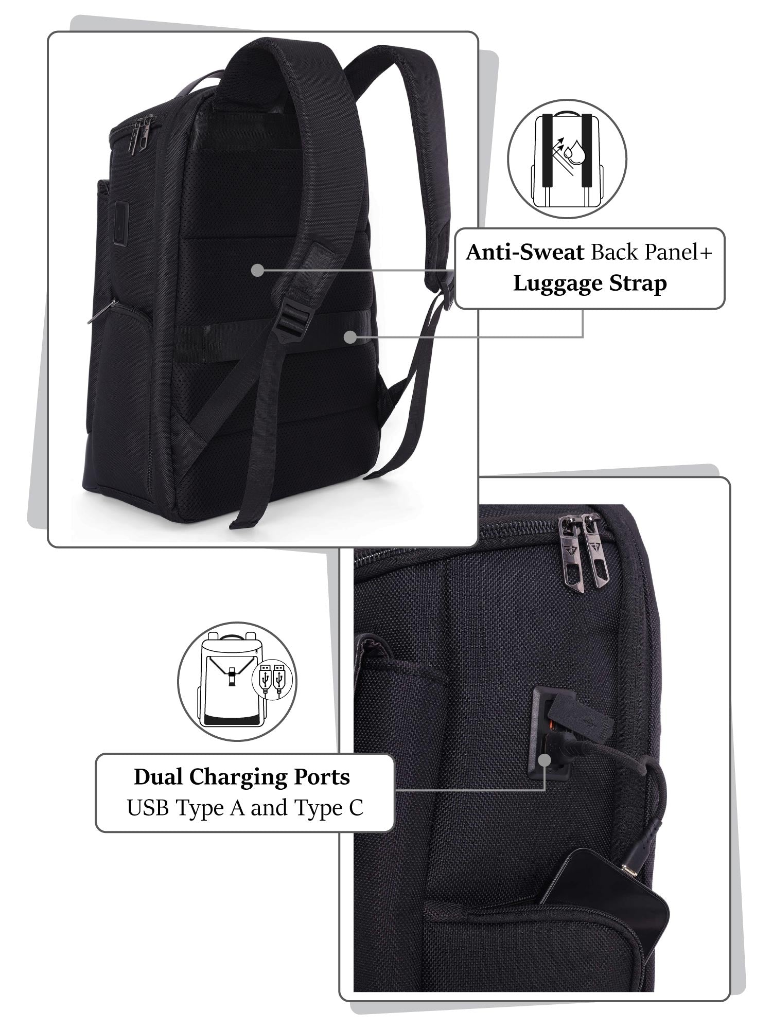 Equipped with a smart USB charging port: USB-C for charging your phone on the move, and USB-A to power up your bank from inside the bag. No messy cables, just clean power access. -