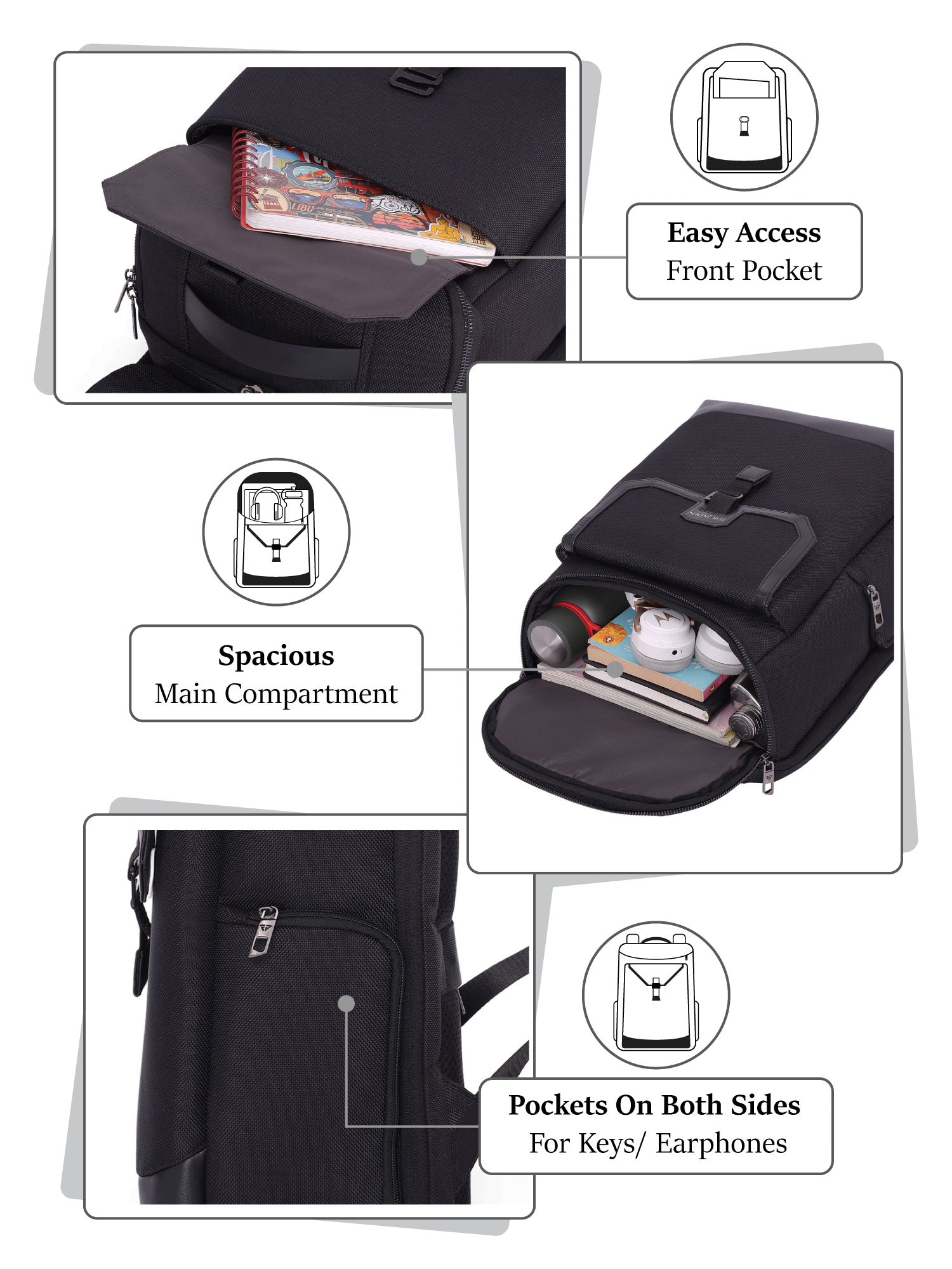 Two external side pockets perfectly sized for your charging cables, earbuds, snacks, or whatever you need quick access to. -