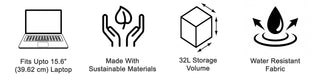 - Capacity: 32 liters; Weight: 850 grams; Dimensions: 30 cms x 20 cms x 45 cms (LxWxH). Laptop Compatibility: Upto 15.6 Inch Laptops