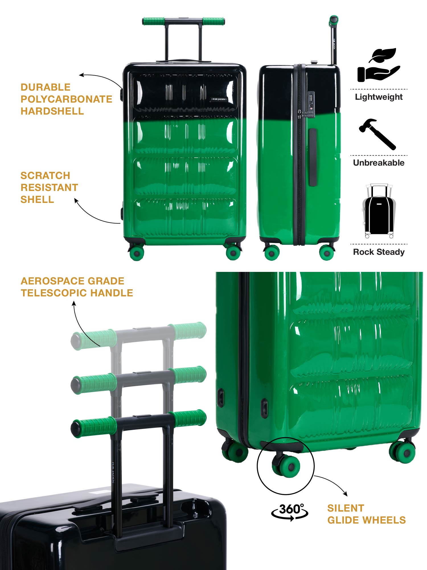 Turn heads at the airport with this dual-tone polycarbonate suitcase that screams style and strength. Crafted from premium German polycarbonate, it’s not just unbreakable but also ultra-light, making your travels smooth and carefree.