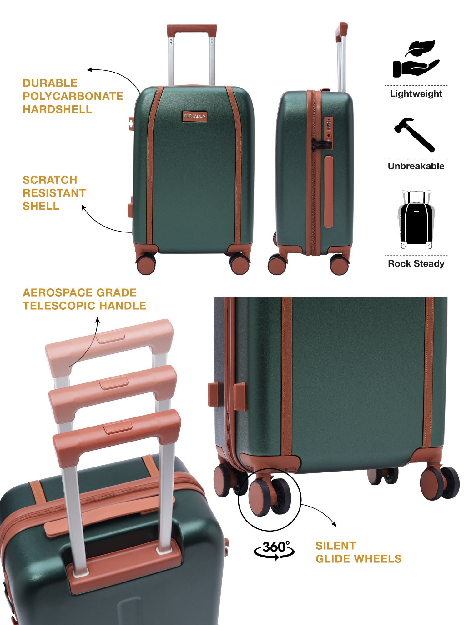 Elevate your travel experience with The Wayfarer, our classic polycarbonate suitcase, a fusion of timeless style and modern performance. Featuring a retro-inspired design with a luxurious metallic sheen embedded into the unbreakable polycarbonate shell, this suitcase is as durable as it is elegant. Ideal for all ages, it boasts a secure TSA-approved lock, aerospace-grade trolley system, and silent StealthTech wheels for a butter-smooth glide. Enhanced with premium vegan leather trims for an extra touch of sophistication, the suitcase is lightweight and easy to maneuver, while the built-in internal organizer ensures your belongings stay perfectly arranged. The Fur Jaden Wayfarer – a modern classic that redefines travel.