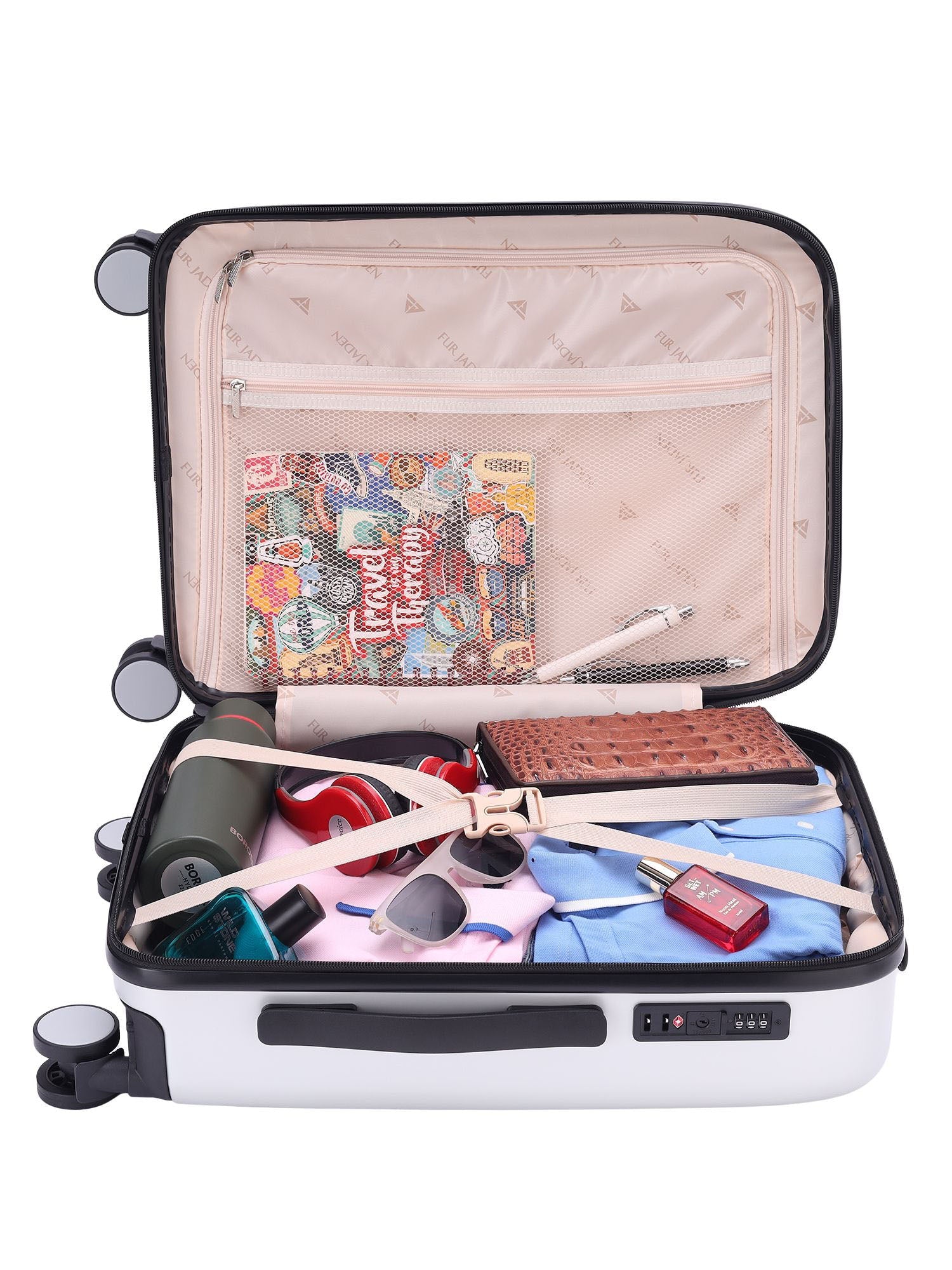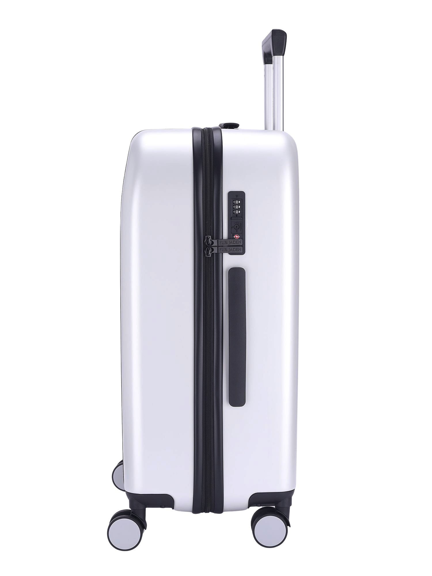 Elevate your travel experience with The Wayfarer, our classic polycarbonate suitcase, a fusion of timeless style and modern performance. Featuring a retro-inspired design with a luxurious metallic sheen embedded into the unbreakable polycarbonate shell, this suitcase is as durable as it is elegant. Ideal for all ages, it boasts a secure TSA-approved lock, aerospace-grade trolley system, and silent StealthTech wheels for a butter-smooth glide. Enhanced with premium vegan leather trims for an extra touch of sophistication, the suitcase is lightweight and easy to maneuver, while the built-in internal organizer ensures your belongings stay perfectly arranged. The Fur Jaden Wayfarer – a modern classic that redefines travel.