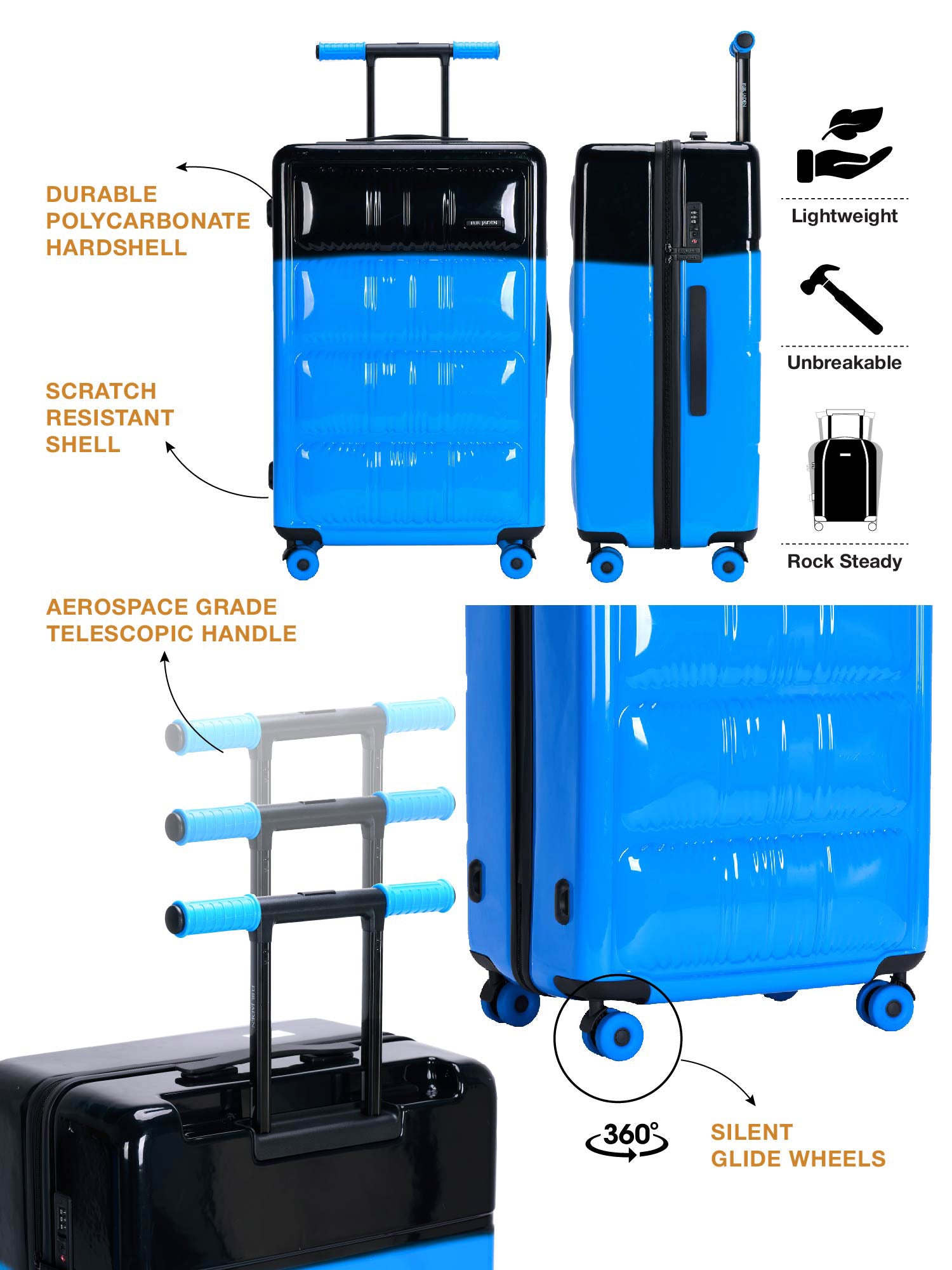 Turn heads at the airport with this dual-tone polycarbonate suitcase that screams style and strength. Crafted from premium German polycarbonate, it’s not just unbreakable but also ultra-light, making your travels smooth and carefree.