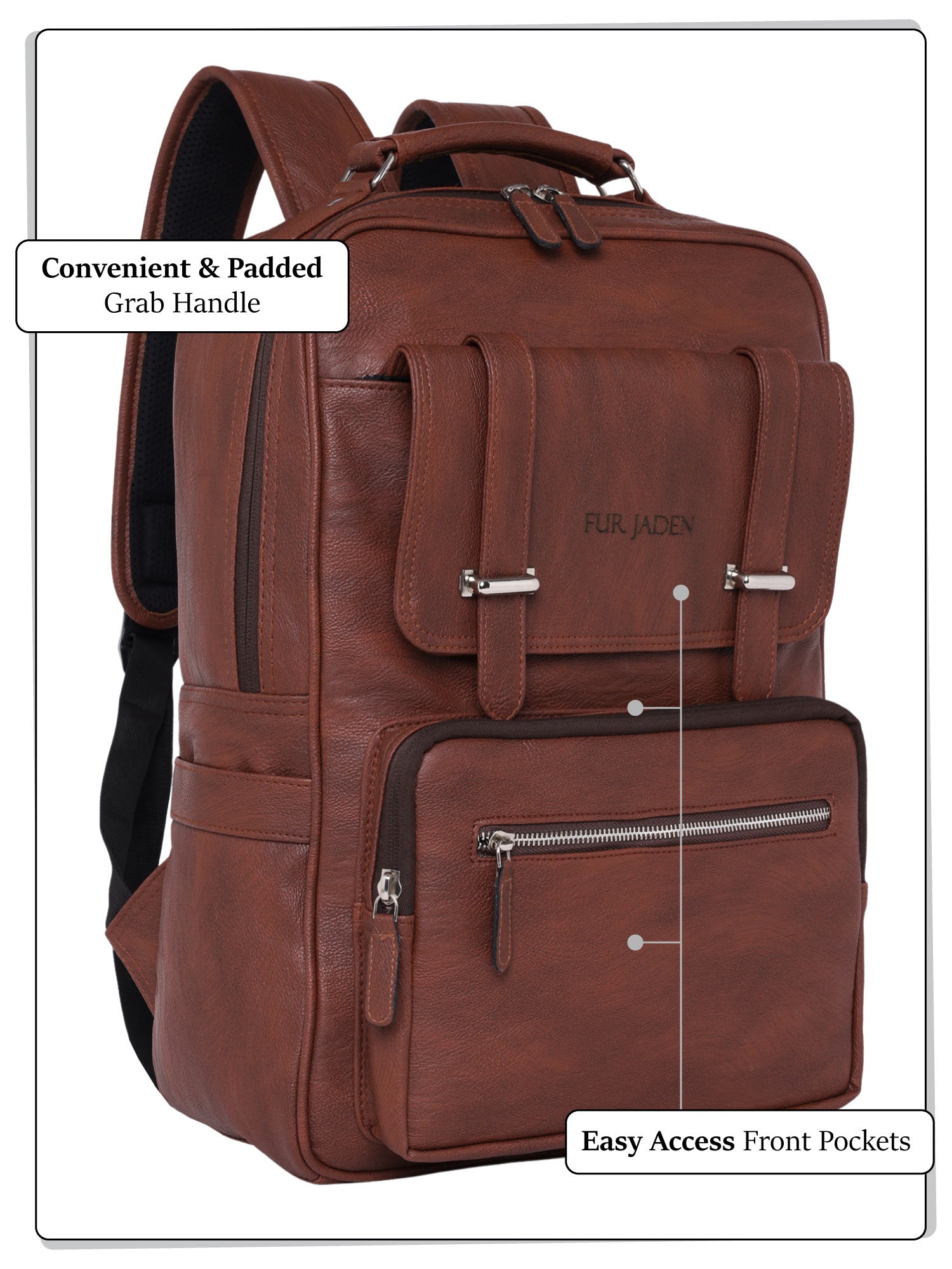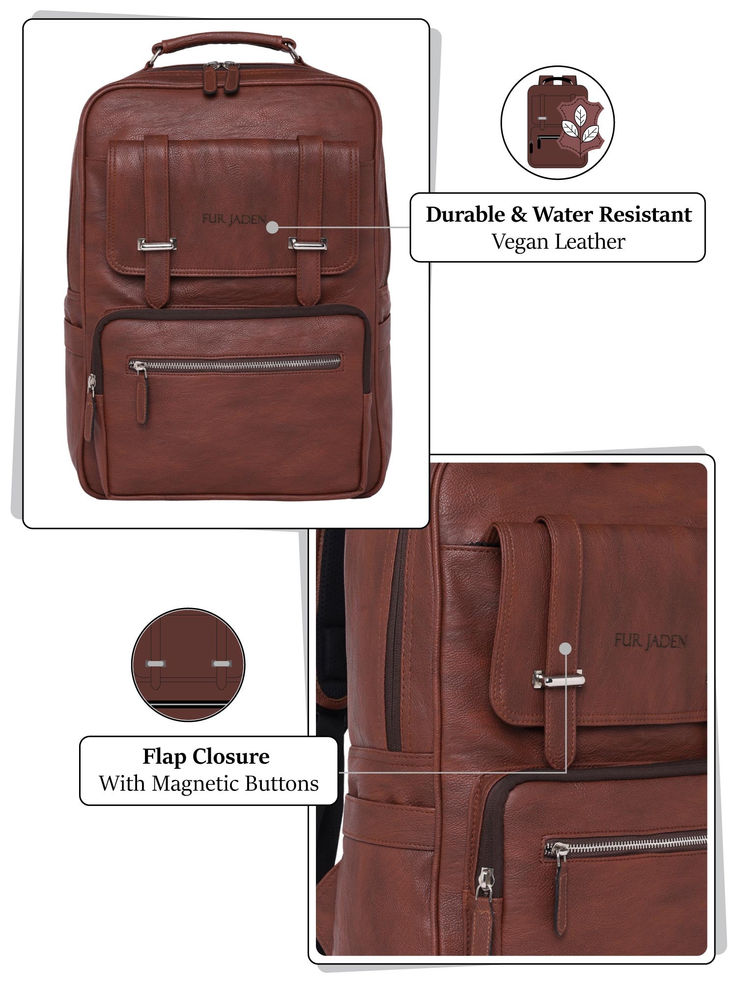 - Premium Vegan Leather: Made from durable and eco-friendly vegan leather, this backpack is a guilt-free fashion choice. Built to withstand the demands of daily use, this backpack is crafted with durability in mind, ensuring it accompanies you through various adventures.