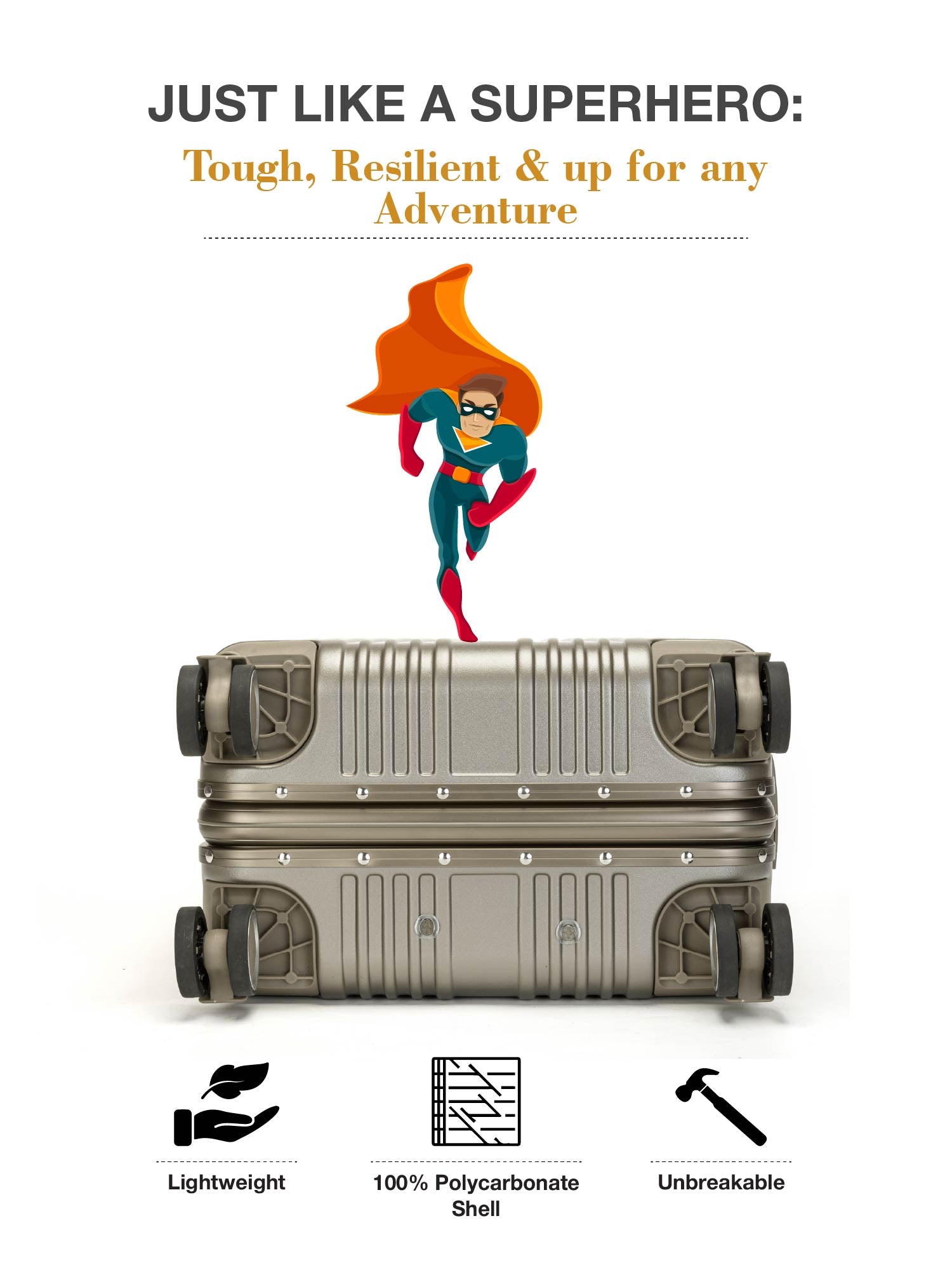 Introducing The Voyager - Retro Luxe Polycarbonate Suitcase – where classic design meets modern innovation. Crafted from durable, unbreakable polycarbonate with a luxurious metallic sheen, this suitcase blends timeless elegance with advanced functionality. Designed for all ages, the suitcase is equipped with dual TSA locks, an aerospace-grade trolley system, and stealth technology for a noiseless, smooth-gliding experience. Whether you're a frequent flyer or a casual traveler, this suitcase elevates your journey with its butter-smooth glide, built-in water bottle/coffee mug holder, and lightweight structure. The Retro Luxe Polycarbonate Suitcase – the perfect fusion of style, durability, and convenience.