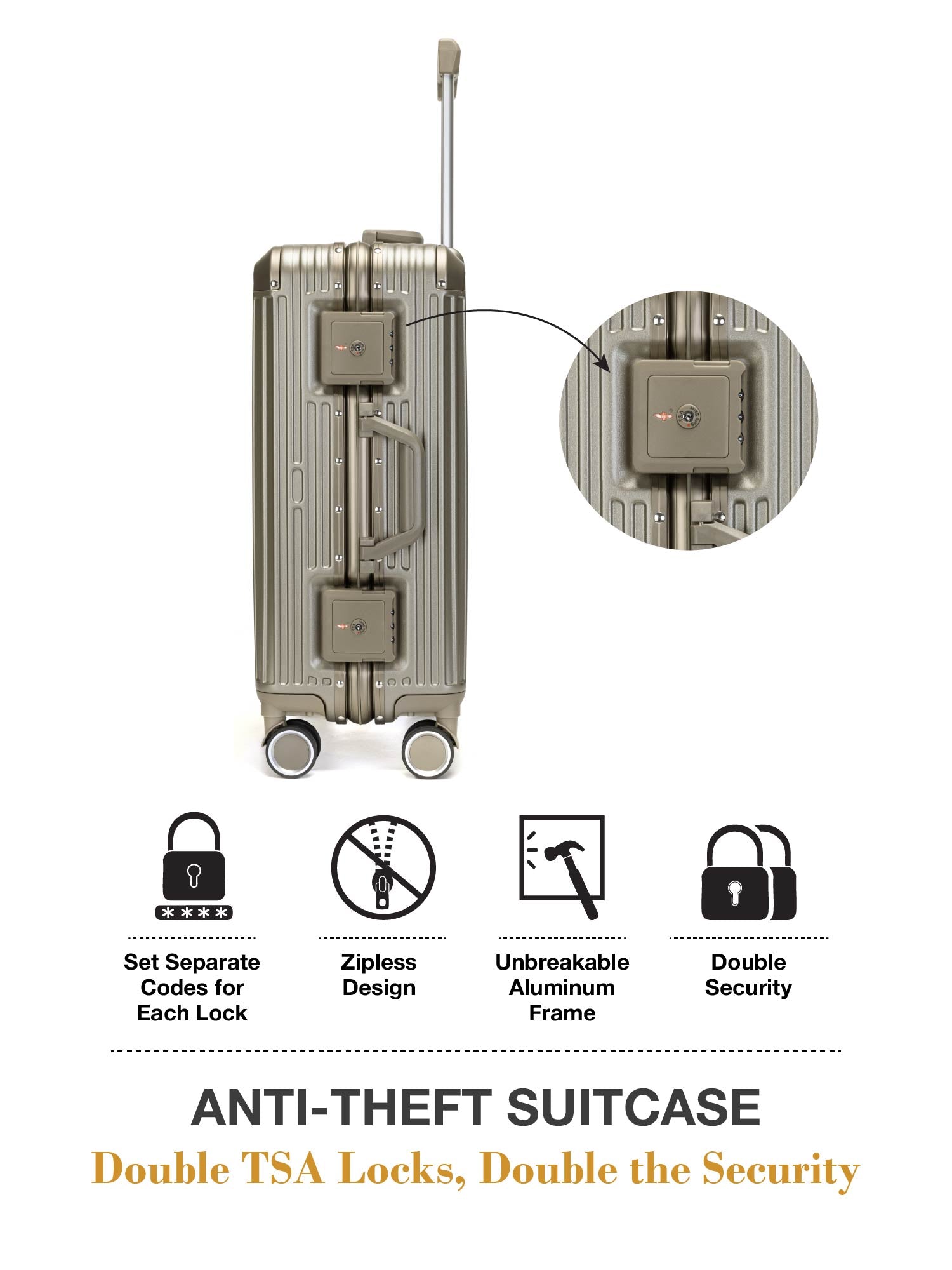 - Anti-Theft Aluminum Frame: Built with a robust, zipless aluminum frame for enhanced security and peace of mind while traveling.